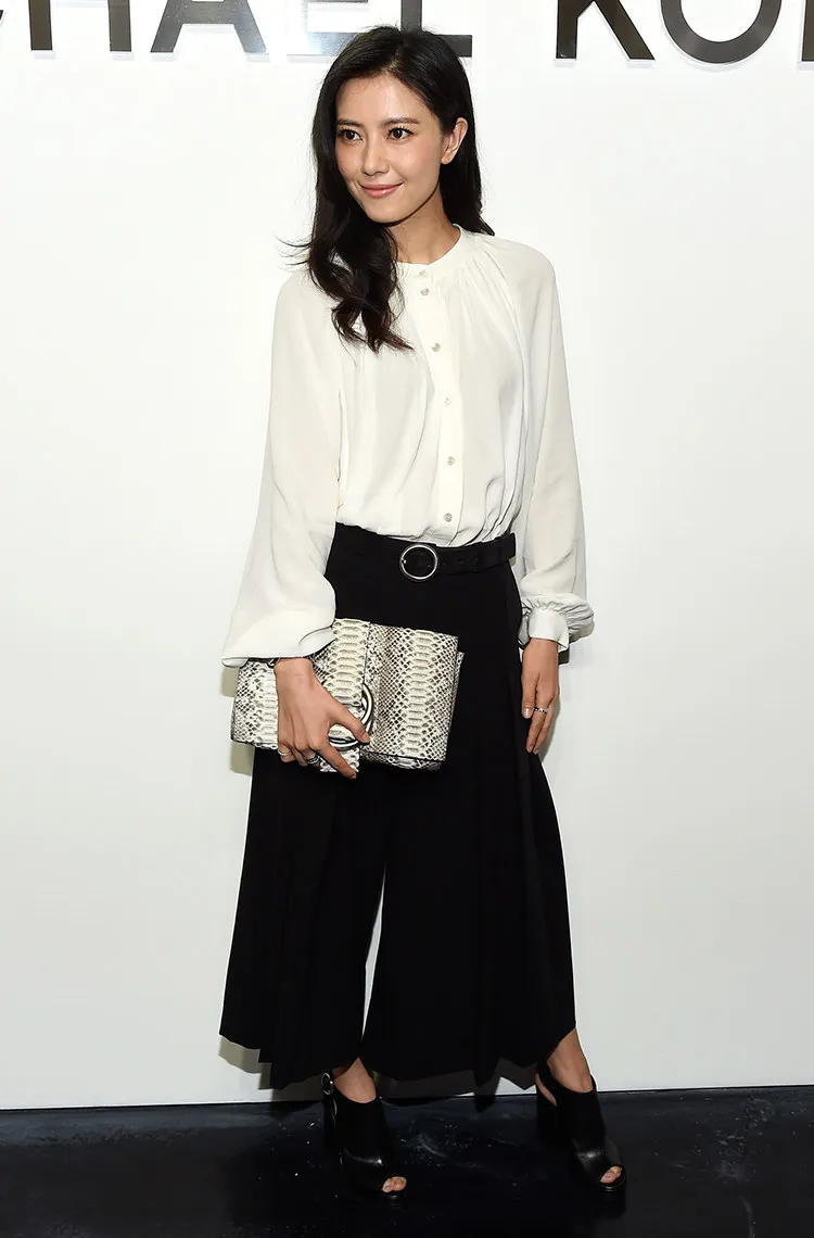 White blouse, black culottes and Patras sling-back platforms and a natural python Julie clutch, all from the Michael Kors Fall 2014 Collection