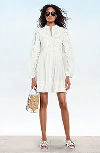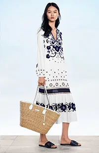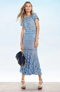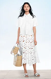 本季的主题是夏日独家风格。花朵廓形,亲肤质地,女性化十足的装饰,中长裙裙边,花边和蕾丝等等细节释放出浪漫气息。花朵
